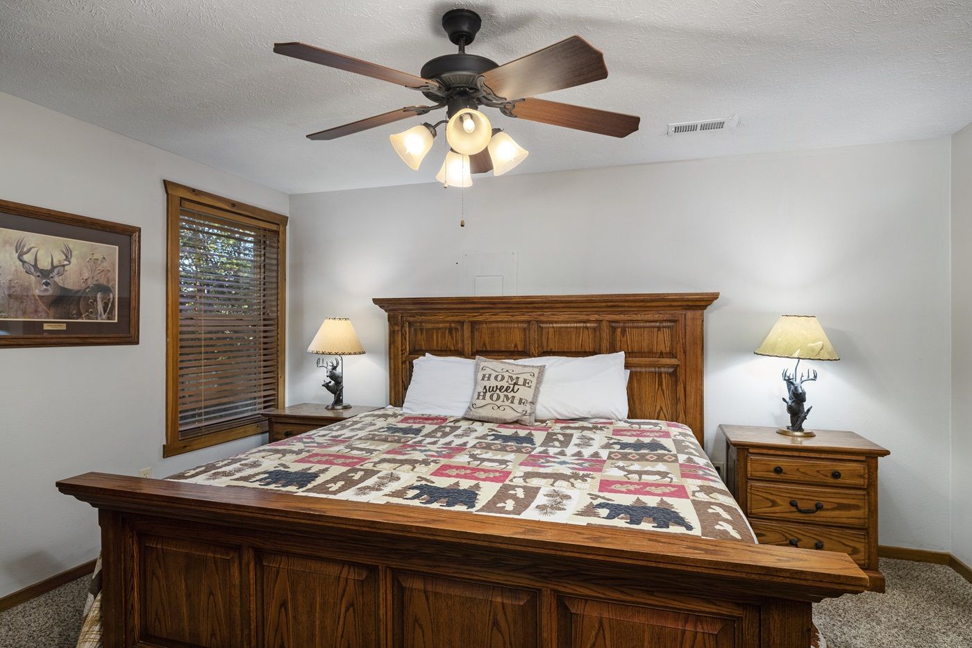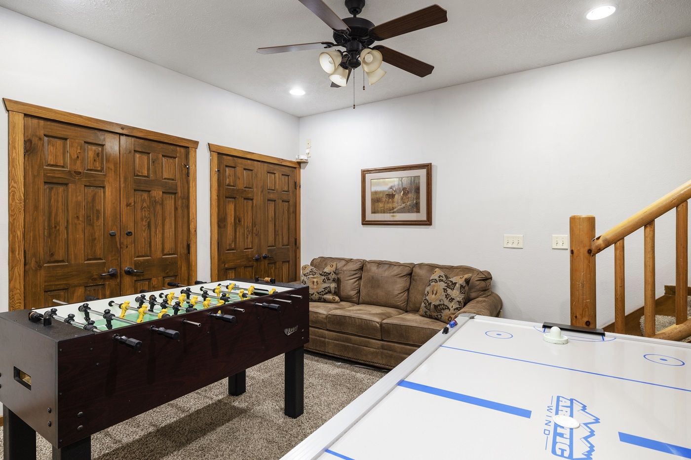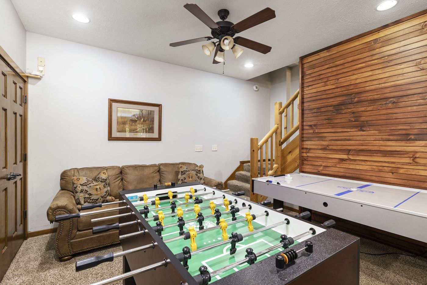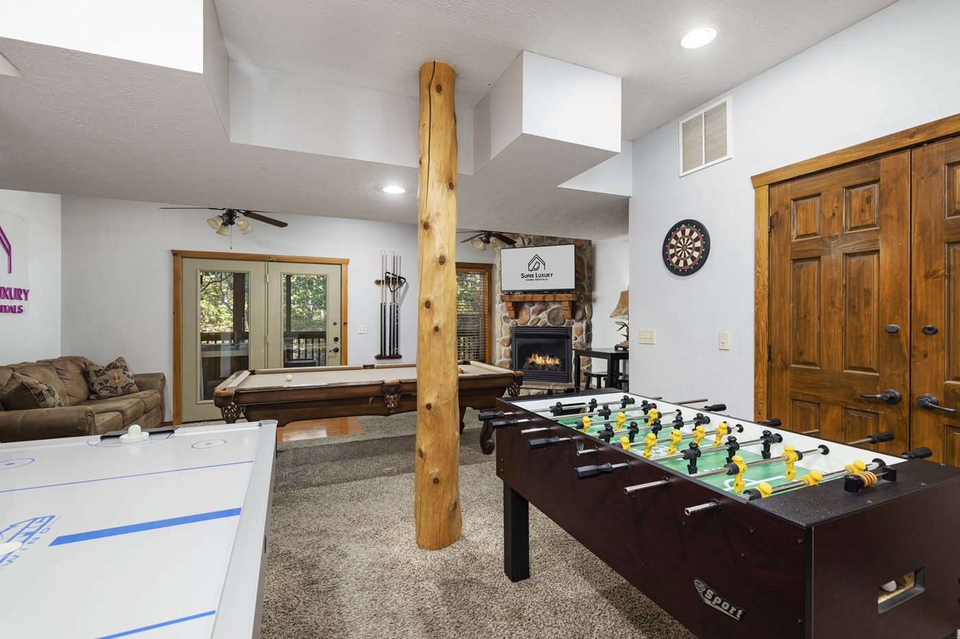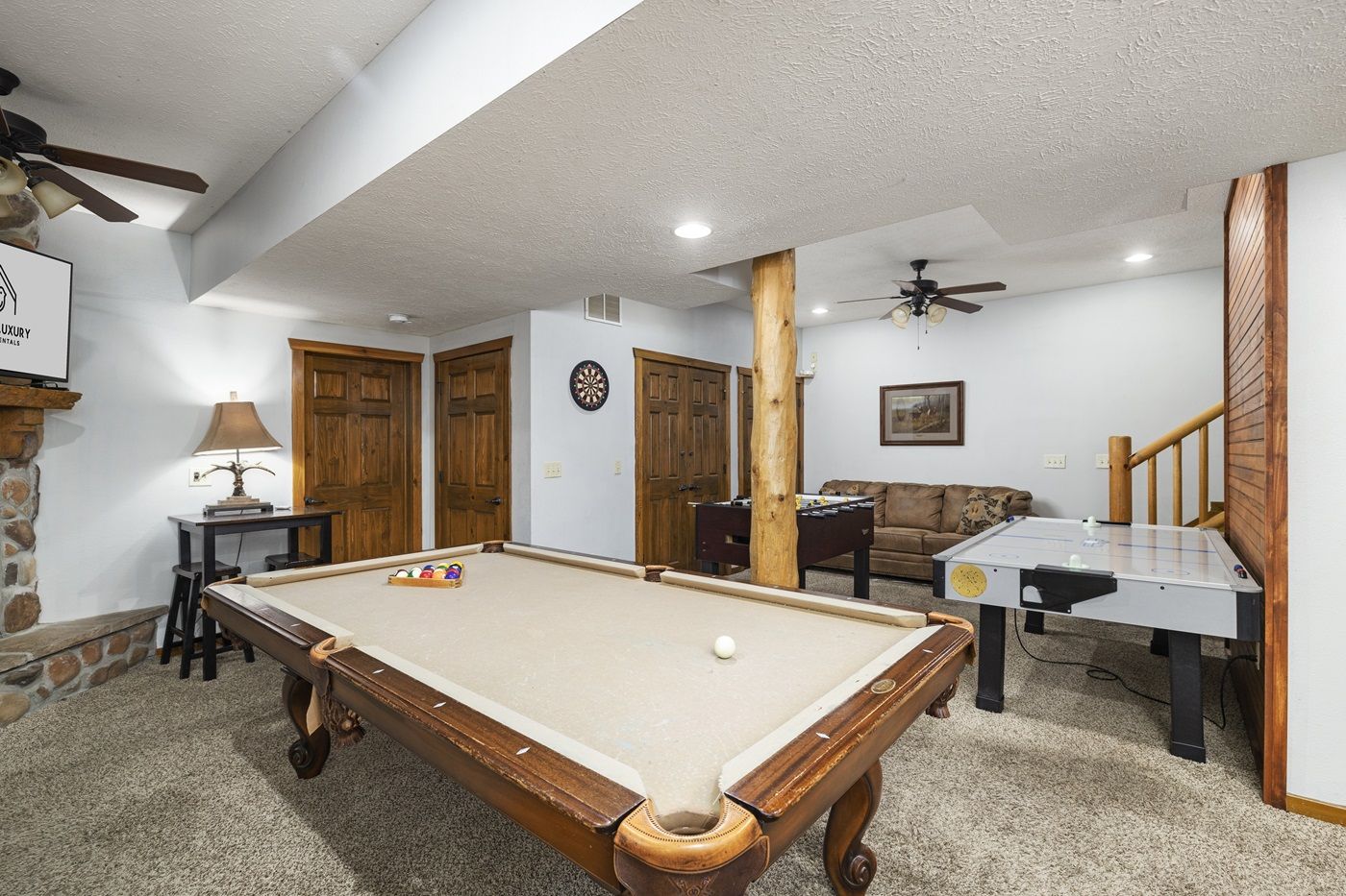 The main level of this gem of a home has two primary suites with King size beds, large TVs, and en-suite jetted bathtubs. Upstairs, you will find two more suites also with King size beds, large TVs, and en-suite jetted bathtubs, but these rooms also include a bonus sofa bed. The downstairs Game Room was designed for entertainment and is a great place to hang out, catch a game on TV, soak in the fire, or try your hand at a one of the many games. This fun-filled space includes a pool table, air hockey, foosball, darts, board games, TV, and two sofa beds. Kids will love hosting slumber parties in the adjacent bunk room which includes 4 Full size beds. The downstairs is also home to a suite with a King size bed with it’s own en-suite bathroom. Best of all the game area boasts a gorgeous stone fireplace, making it the perfect spot for a winter getaway with your loved ones.