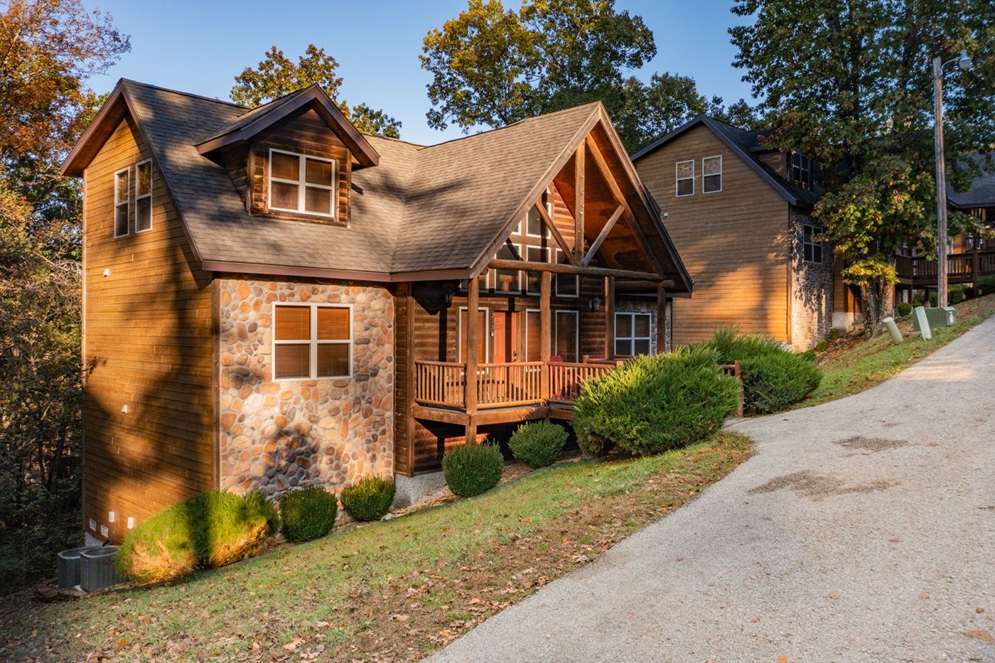 This beautiful log cabin welcomes you to the Ozarks with a vaulted front porch adorned with rocking chairs. The charm continues the moment you step inside with lofty wood ceilings and a cozy living area warmed by a stone fireplace. After a day spent enjoying the community amenities, including a swimming pool and hot tub, you can kick back on the sofa to watch the game or enjoy a movie. The open-concept living area is perfect for some family time or just a quiet evening in front of one of the two gas fireplaces. When mealtime comes around, you can get creative in the fully equipped kitchen, revamp some old family recipes and enjoy them around the dining room table or enjoy dinner on the deck while taking in the fresh air and beautiful trees.